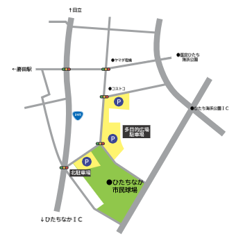 | 臨時バス | JR勝田駅東口②のりば~ひたちなか市民球場前 行き 11:00 ,12:00 / 帰り 試合終了後 運賃(片道):大人450円/子供230円 ※定期路線バスをご利用の場合は,JR勝田駅東口②のりばより市民球場入口バス停下車(徒歩15分)をご利用ください。 |
